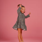 Dress with flounces made of micro-flower patterned velvet with keyhole closure on the back with a small button. Velvet is a timeless, comfortable and resistant, soft and plush fabric produced with silk, cotton or synthetic fibres.