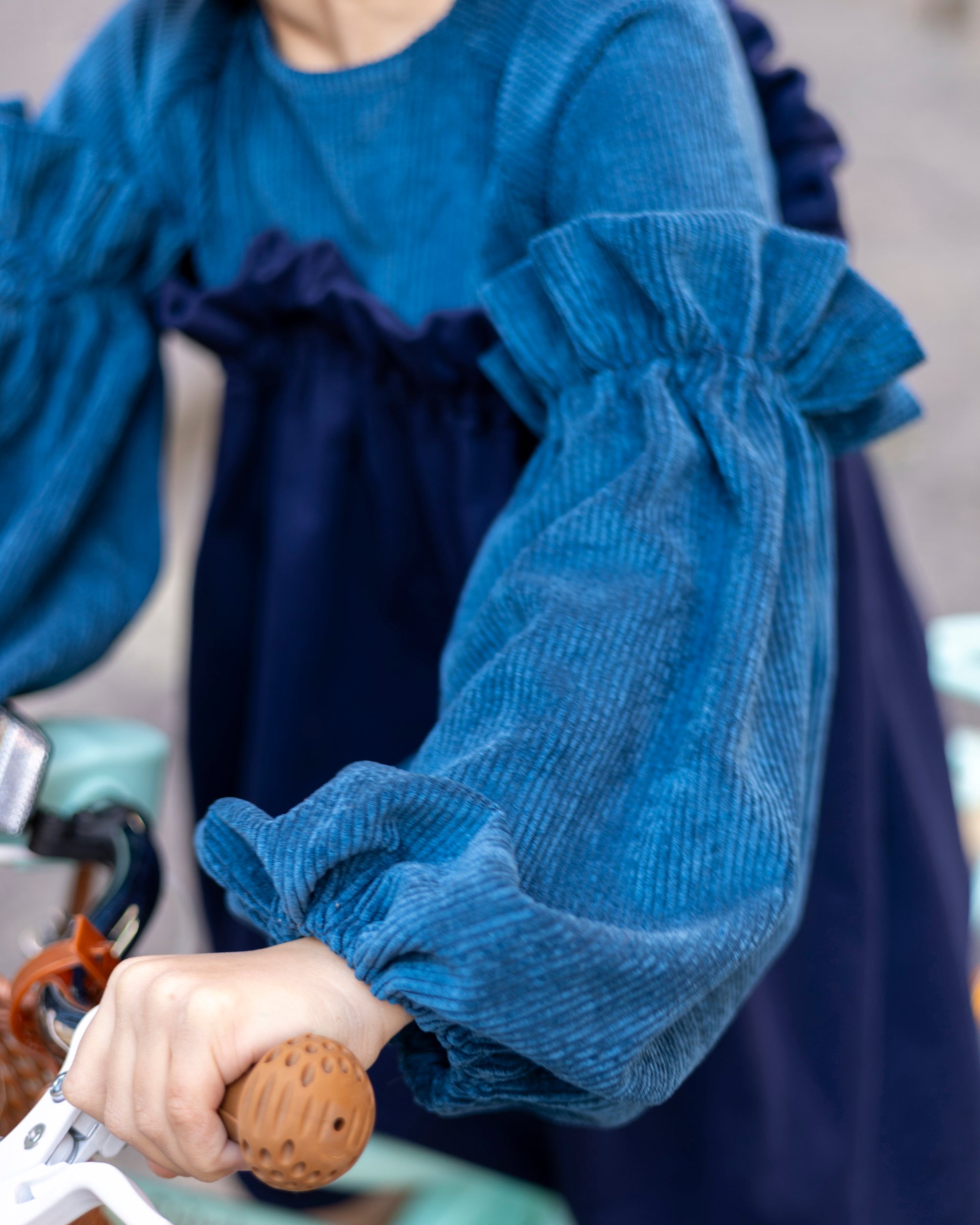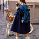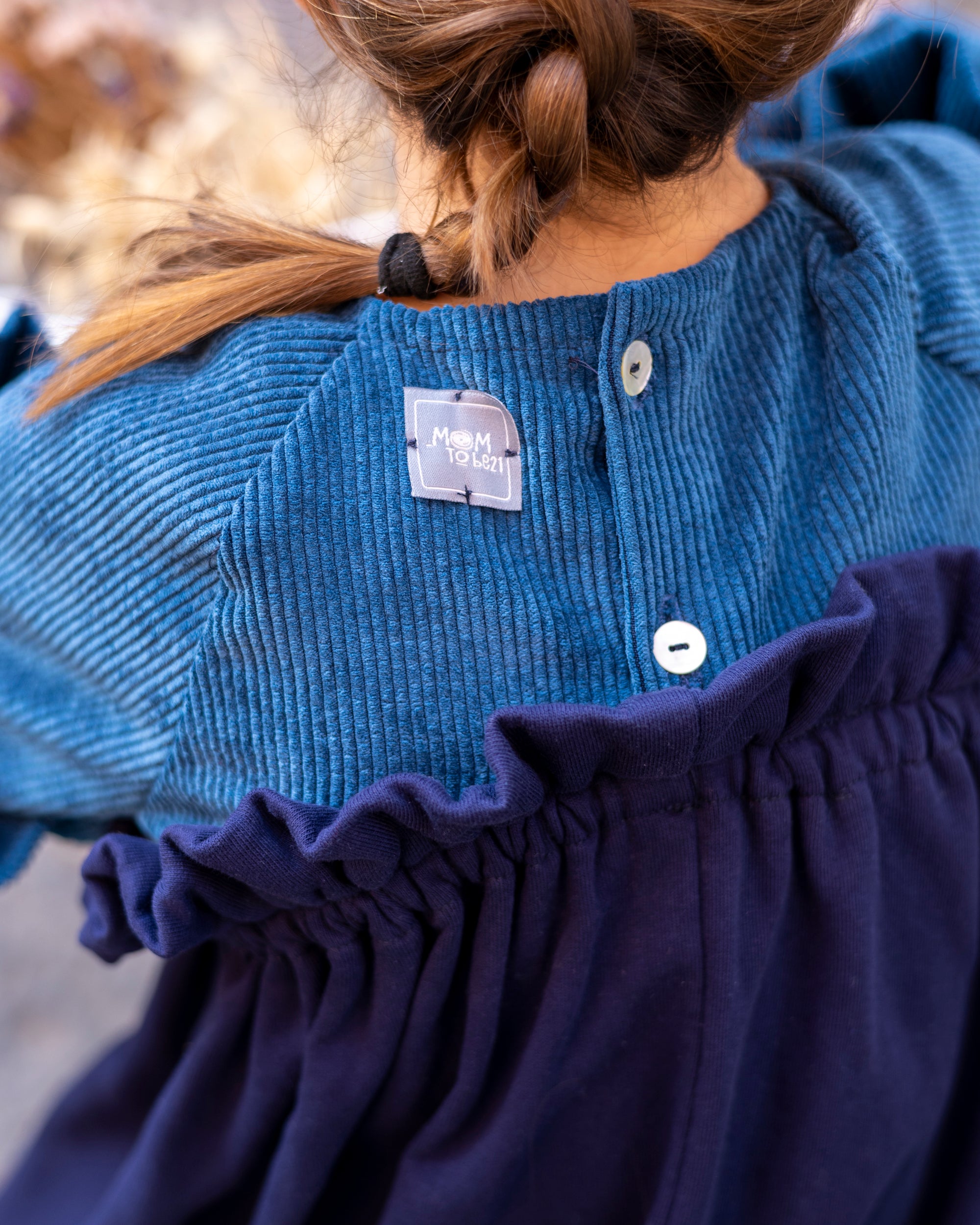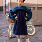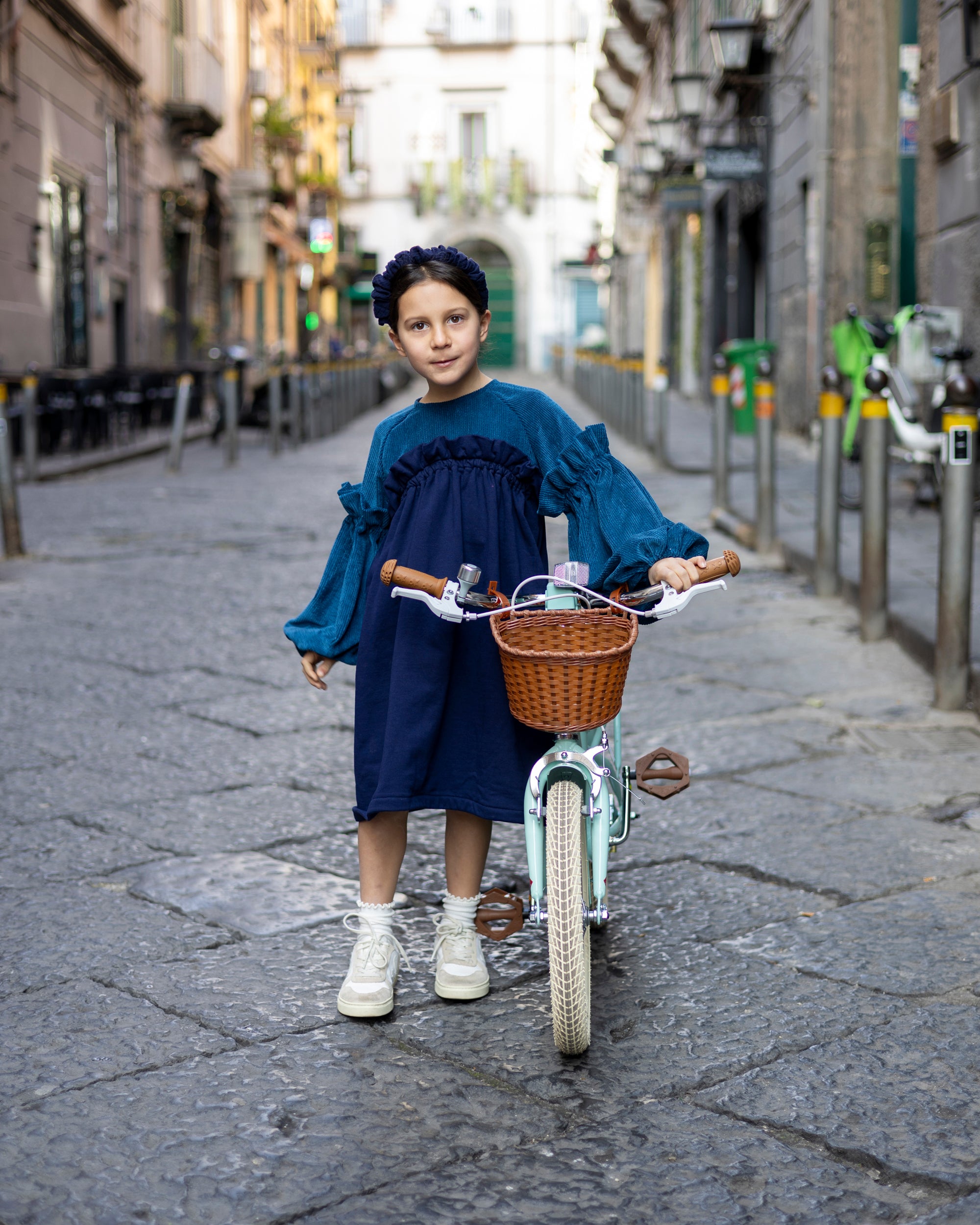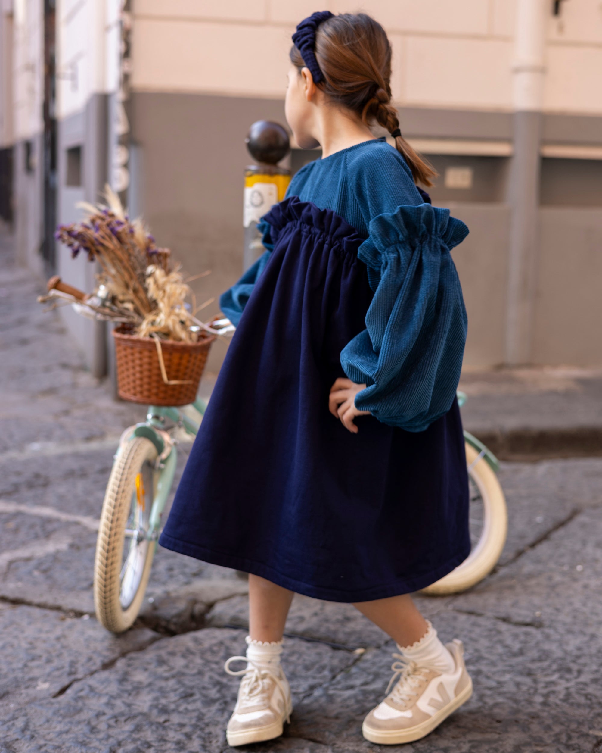 Quest'abito bambina ci trasporta in un universo grafico e colorato. Dinamizzato da maxi lavorazione delle manica, un arriccio che prende vita dalla parte alta del corpetto e si ricongiunge perfettamente alle maniche. La parte del corpetto insieme con la manica è realizzata in velluto , la parte della gonna in jersey : un connubio perfetto !
