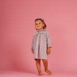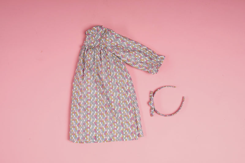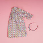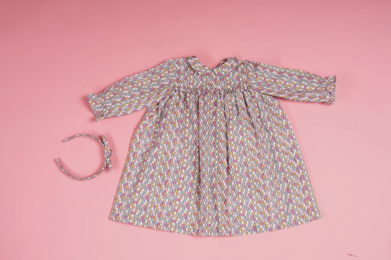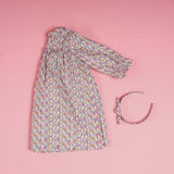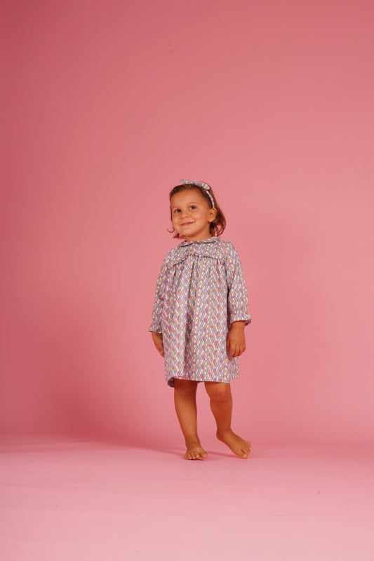 Abito in “rouches” 100% cotone caratterizzato da una chiusura dietro con bottoni ad asola, il prezioso dettaglio della rush che definisce l'abito con motivo geometrico di mille colori che ne anima il design.