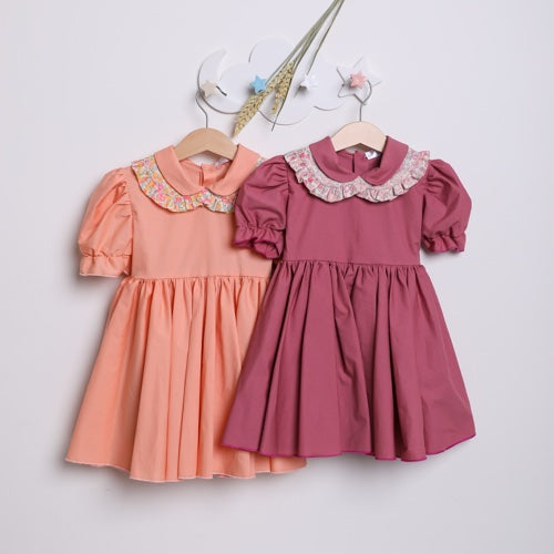 L'abito è interamente realizzato in cotone popeline dalle tinte pastello in contrasto con le pregiate fantasie di liberty cotton lawn.