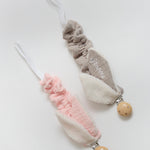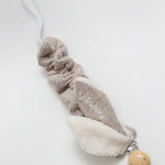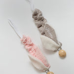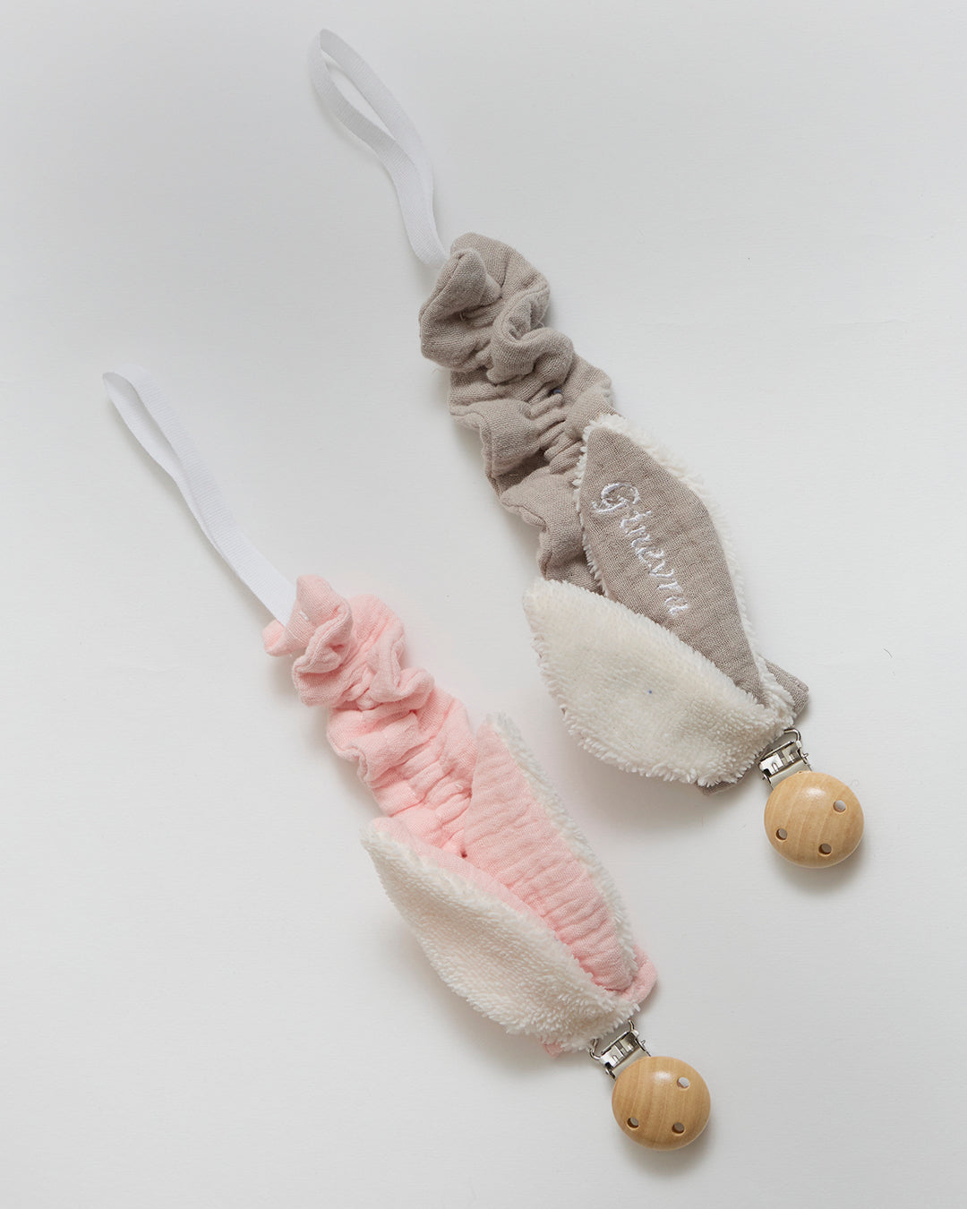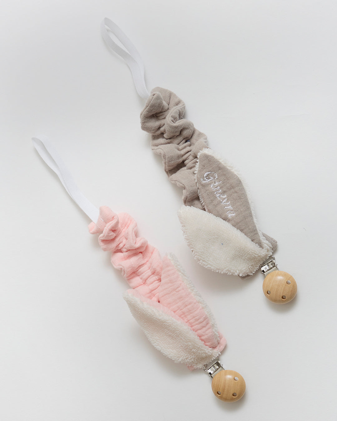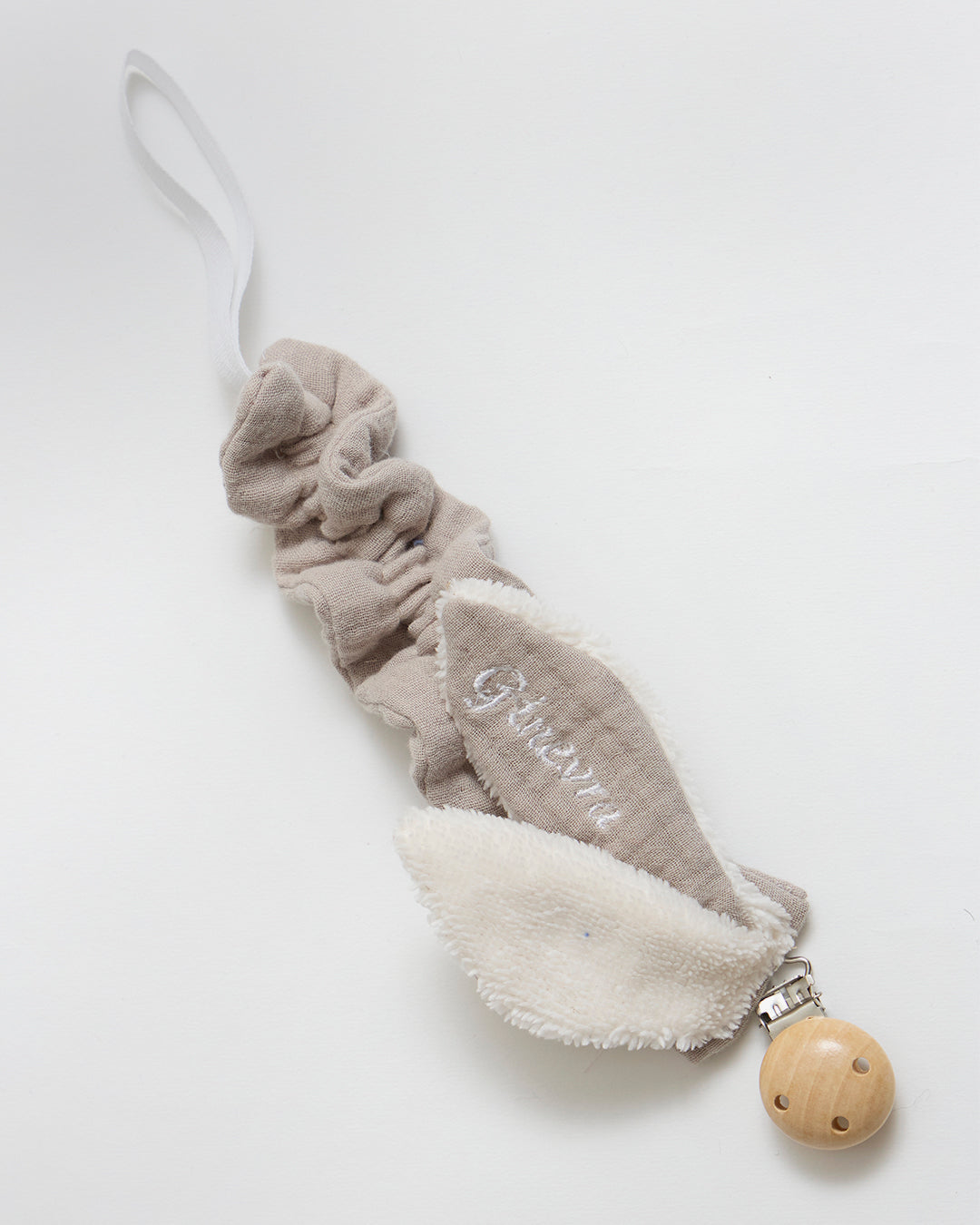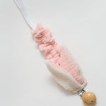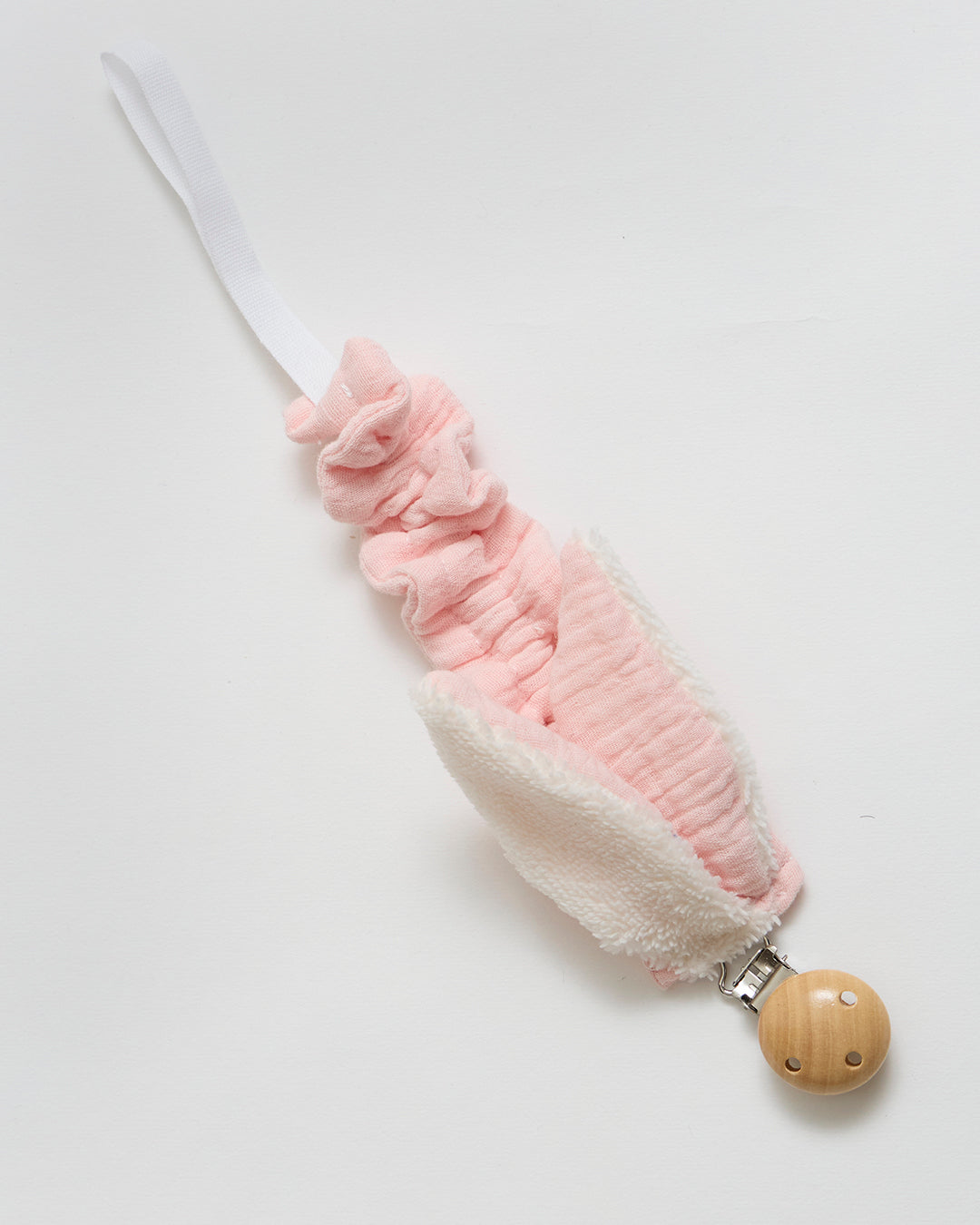 Portaciuccio in cotone organico doppia garza (mussola di cotone) e spugna di bambù 100% con clip in legno e adattatore per ogni tipologia di ciuccio!
