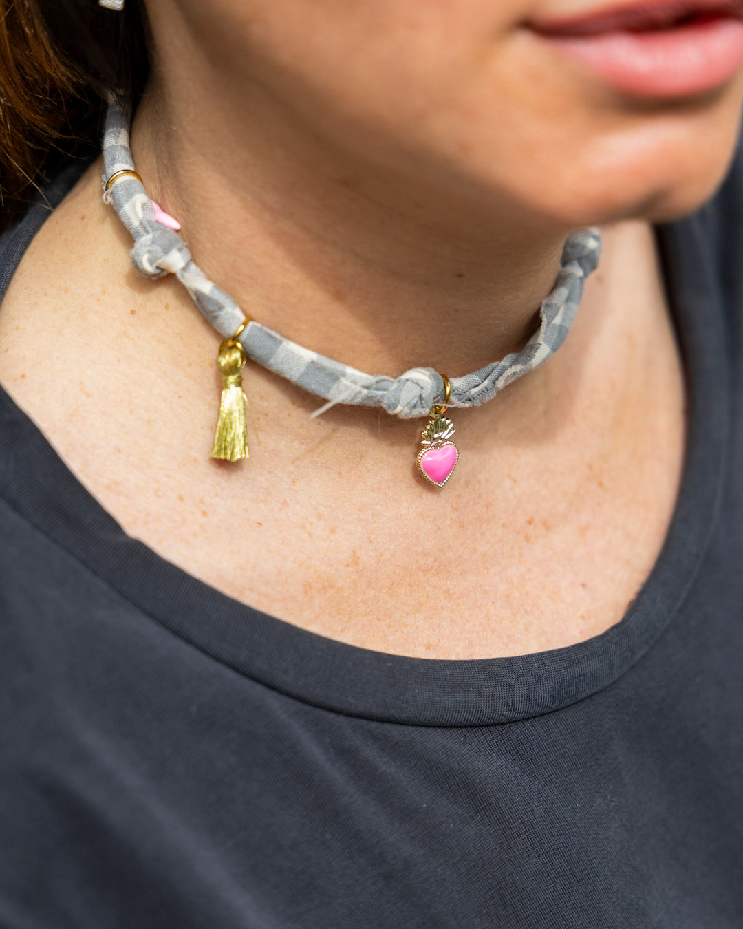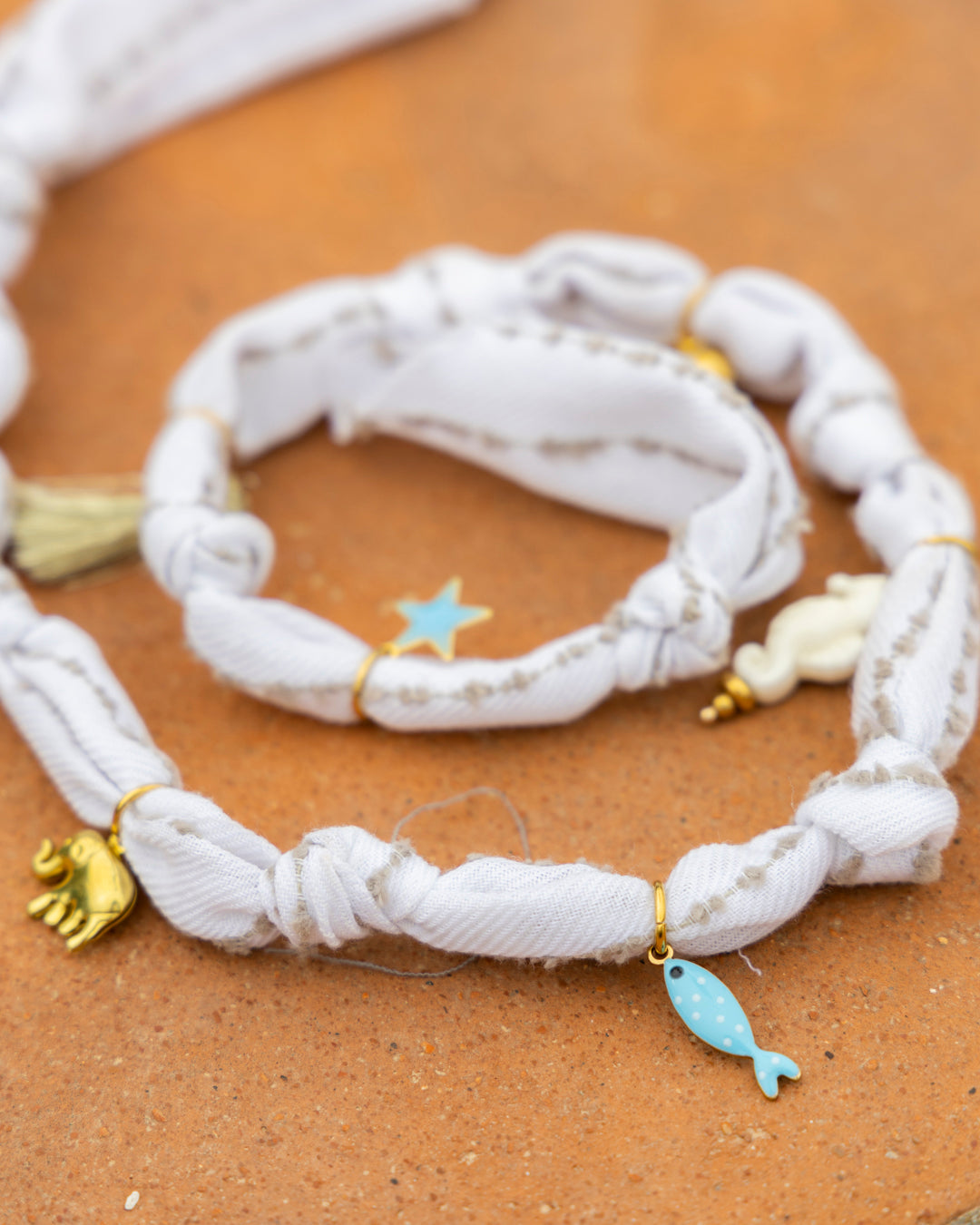 Un drappo di tessuto con ciondoli colorati : annodala dove e come vuoi! La novità sta nel coordinarti con il look del tuo bimbo , hai l possibilità di scegliere il drappo per la collana dello stesso tessuto dell’ outfit del tuo bimbo/a.