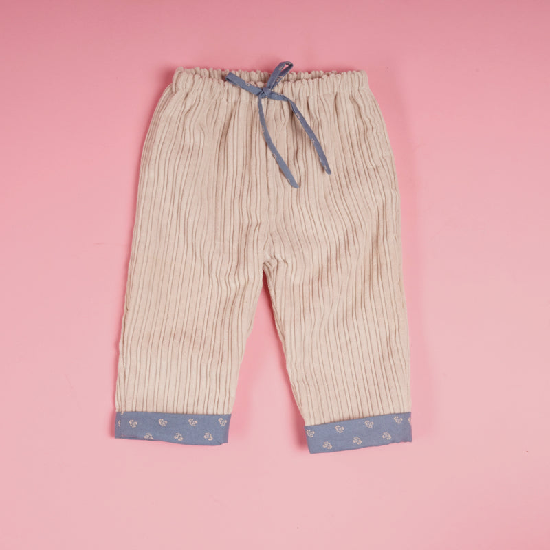 Pantalone in velluto a coste larghe con inserti in cotone popeline oppure in liberty cotton lawn. Questo tessuto dèlavè è estremamente confortevole da indossare e riscalda nei giorni invernali.