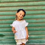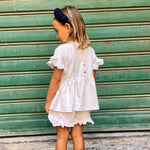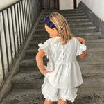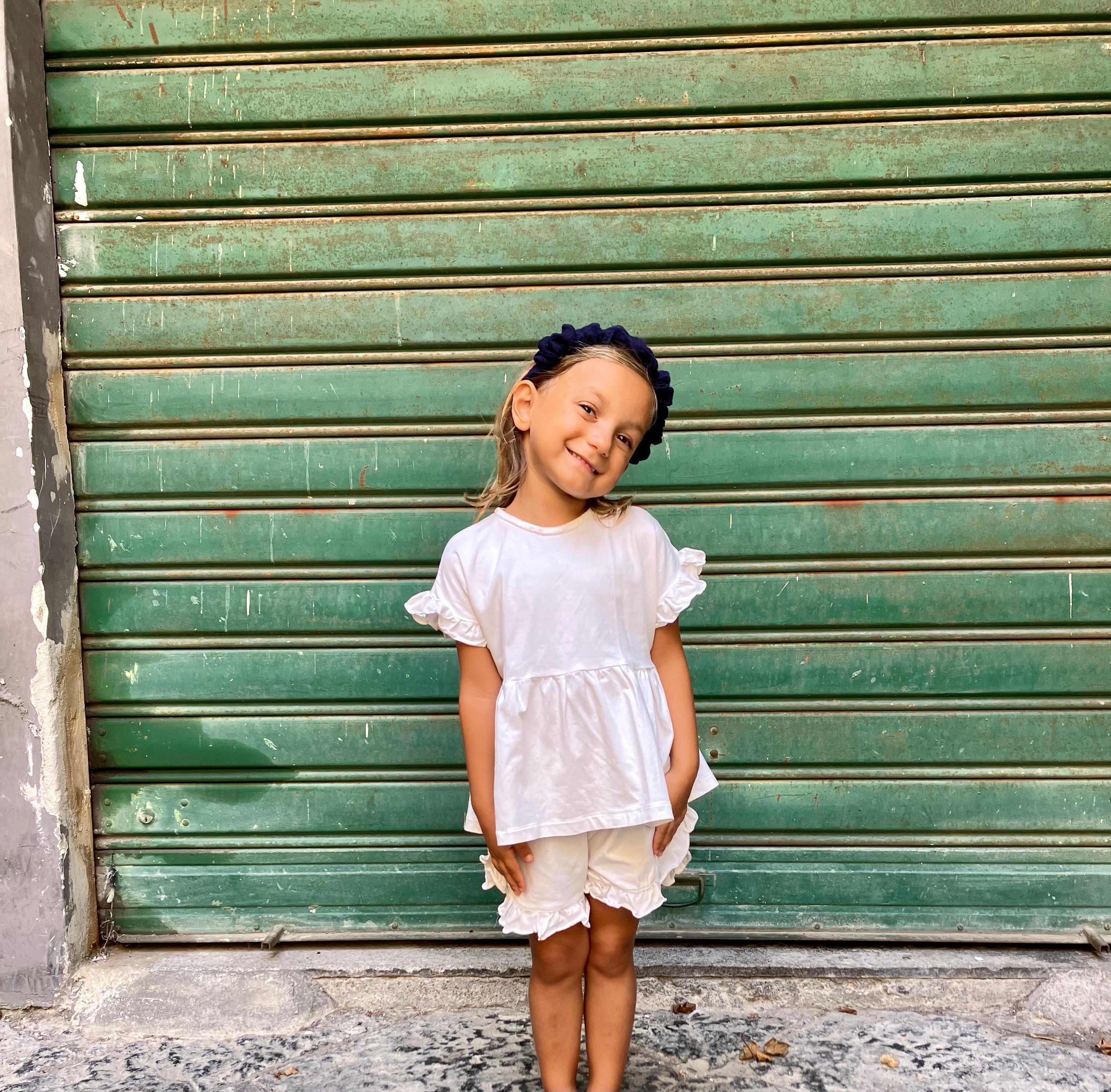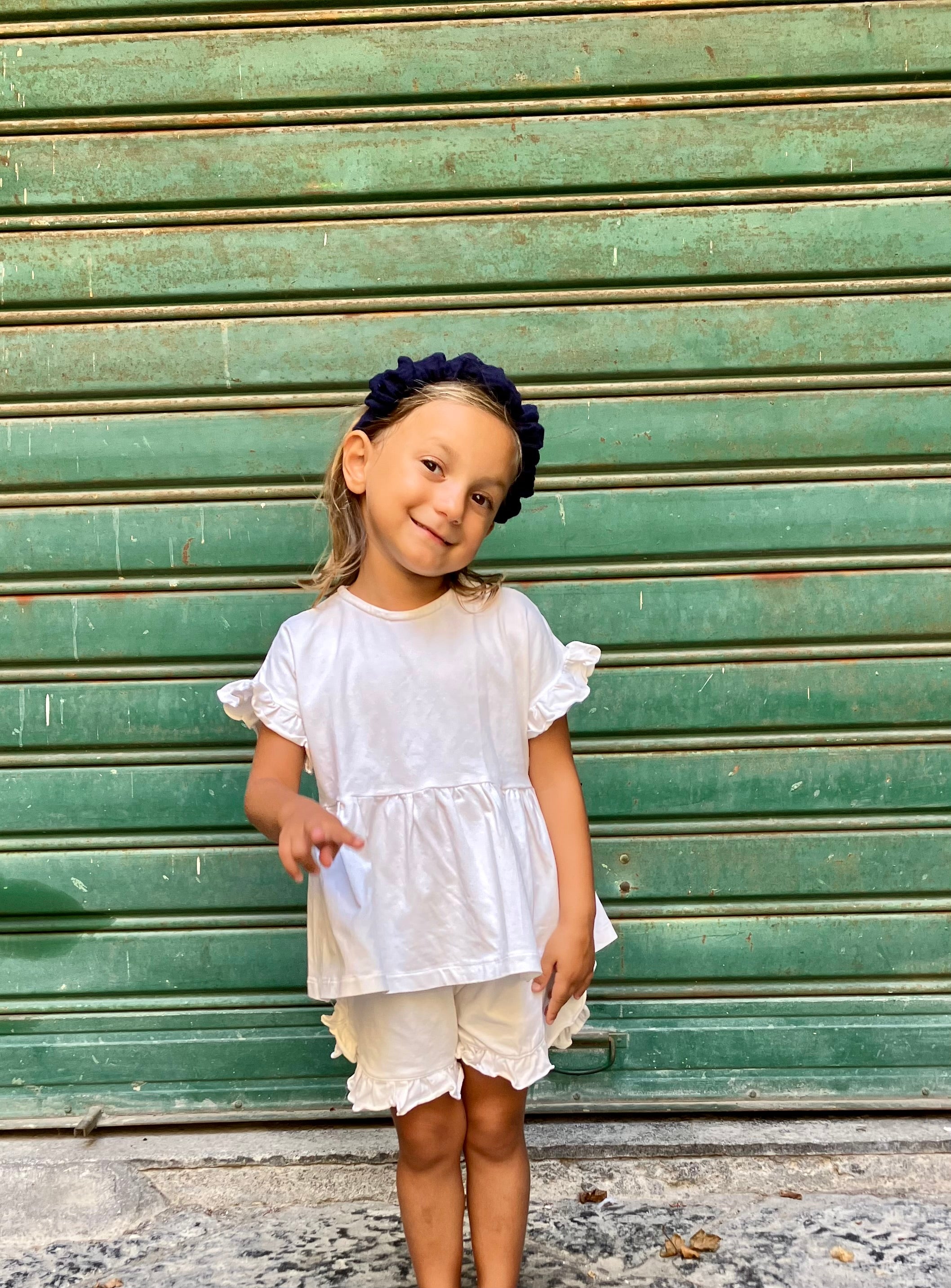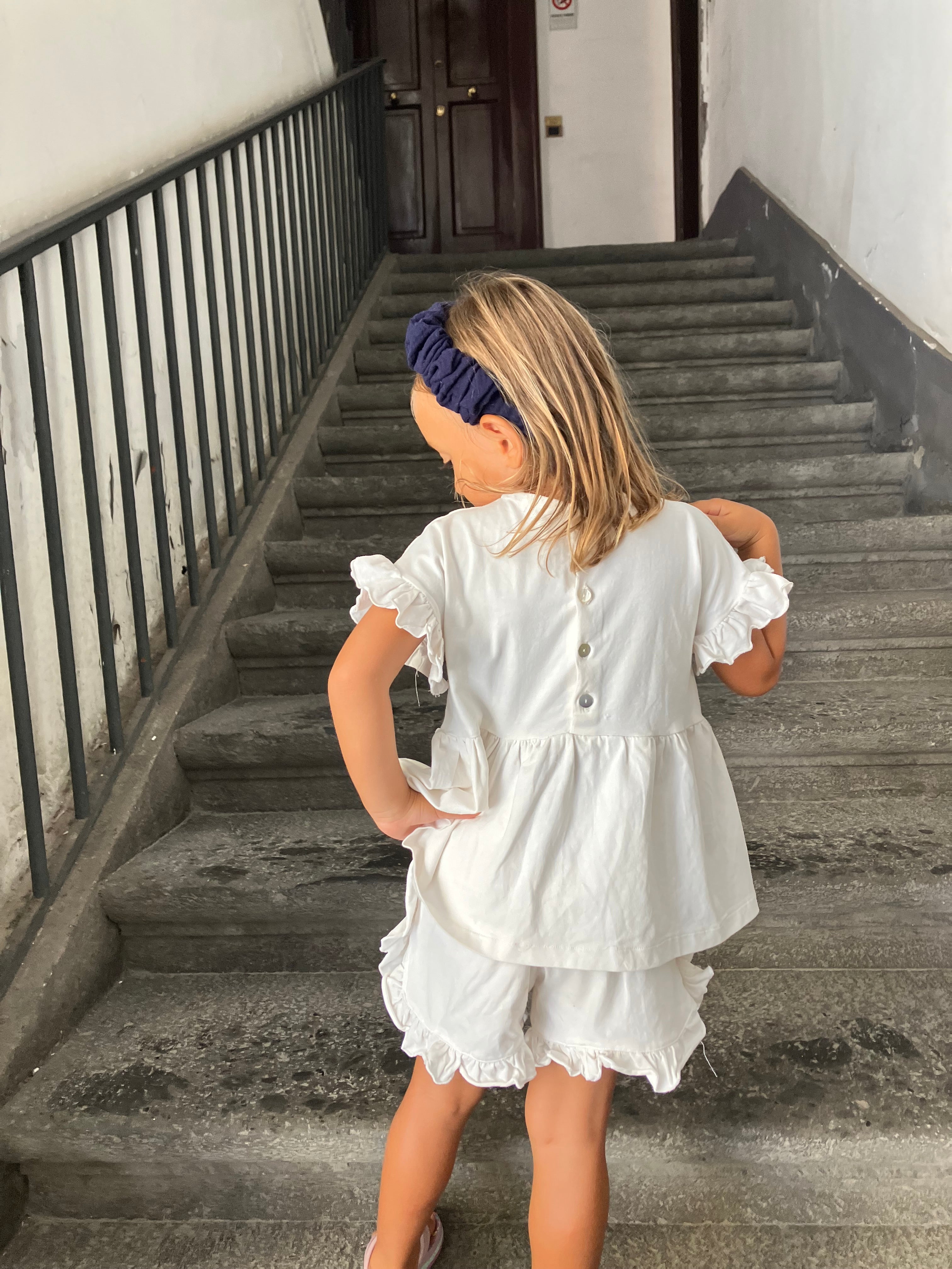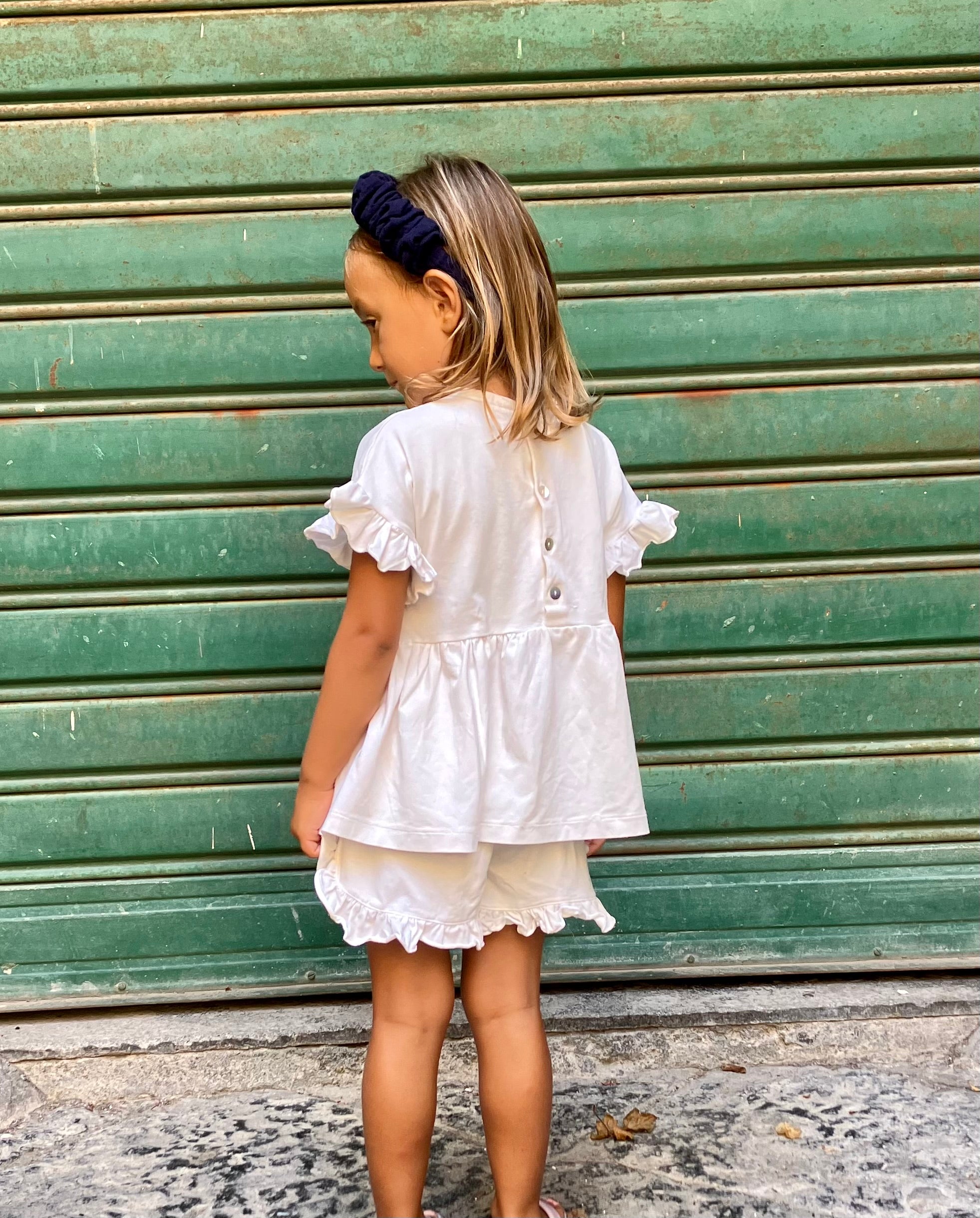 Completo 2 pezzi realizzato in 100% Jersey di cotone , blusa mezza manica con balza e rouches sulla manica e shorts con elastico in vita e rouches. Ricco di stile e femminilità oltre ad essere un capo super utile e versatile .